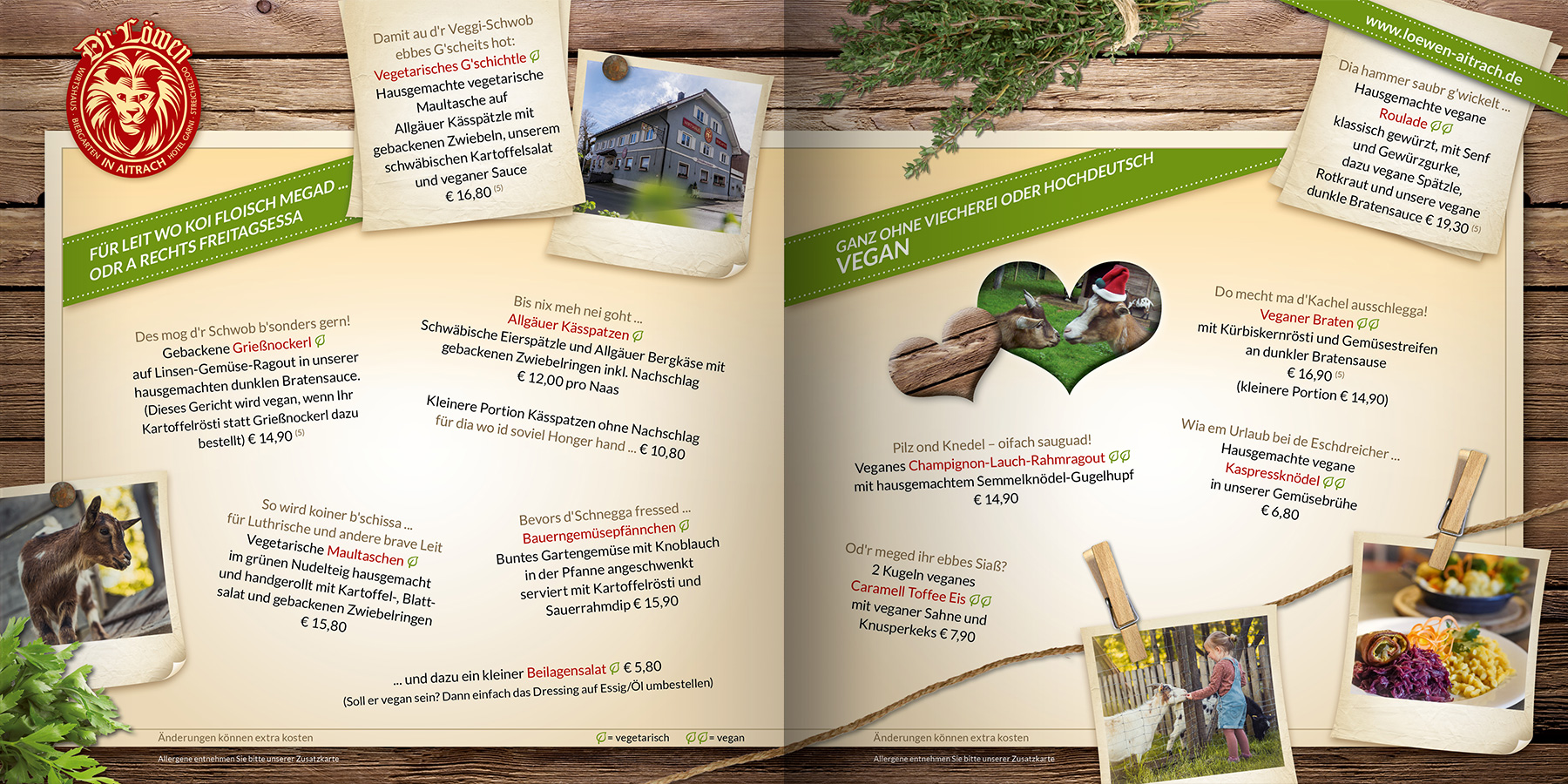 In unserem originell gestalteten Gastthof verbringt so mancher Gast die Zeit nicht nur mit dem Studium unserer schwäbisch-österreichischen Speisekarte, sondern entdeckt aller Orten witzige und hintersinnige Arrangements, die sich dem Besucher manchmal erst auf den zweiten Blick erschließen. Besonders zünftig wird’s am Freitagabend, wenn es die Schweinshaxen ganz frisch aus dem Rohr gibt. Die Schweinshaxen gibt’s übrigens von Ostern bis 12. September!!